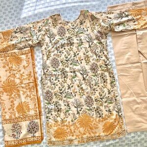 - 3 piece matching set, includes kameez (dress), salwar (pants), and dupatta (scarf)