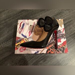 NIB Christian Louboutin 20th Anniversary Pensee Black Patent W/Suede Trimmed Floral Detail on Snap Closure. Purchased at Bergdorfs. Rubber sole added (in red of course) but never worn. Perfect condition! Italian size 36/US 6. Original box with Red Duster and product info/thank you note.