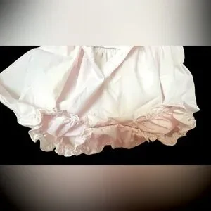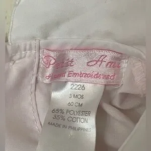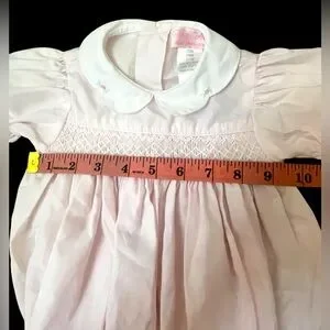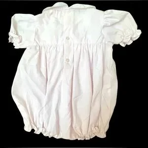 Charming pink baby romper with puff sleeves and smocked detail. Perfect for special occasions.