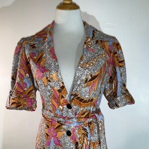 This elegant paisley button down jacket from INC International Concepts features a stylish button down design with a tie front, perfect for a cocktail night out. The short puff sleeves and notched collar add a touch of sophistication, while the plunge neckline enhances its chic appeal. Ideal for making a statement, this jacket combines modern style with timeless elegance.