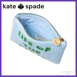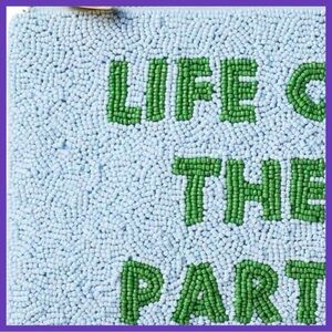 “Compliment your outfit with this Life of the Party Beaded Clutch from kate spade new york x Target. Made from cotton and covered with blue/green beads that spell out "Life of the Party," this clutch-style handbag features a zip closure. Plus, interior credit-card pockets provide extra storage options.”