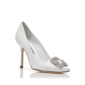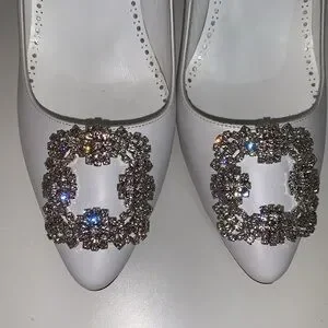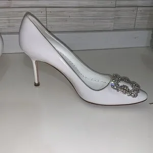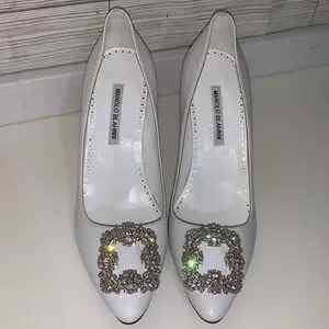 Elegant white heels by Manolo Blahnik featuring stunning embellishments. Perfect for adding a touch of glamour to any outfit.