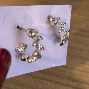 Silver tone hoop earrings with leaf design. These earrings are extremely light and small in size. Perfect for any occasion.