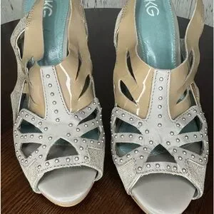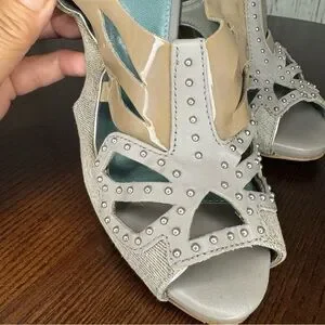 KG KURT GEIGER DENIM, Calf, PATENT Leather Laser Cut Studded heeled Sandals 37
