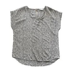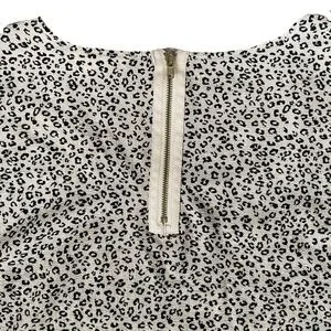 This Pink Rose blouse is blush with black cheetah print. It features a cuffed short sleeve with high low hem. It has an exposed zipper (functional) detail on the back of the neck. This is a simple closet staple that could be dressed up or down.