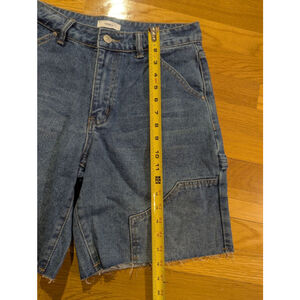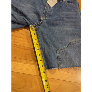 Forever 21 denim shorts, size 27, brand new with original tags. The shorts feature a medium blue wash and a carpenter style design with utility pockets on the sides. The hem is raw and frayed. The shorts have a standard button and zipper closure. Measures approx 14.5" waist, 18" total length, 8.5" inseam.