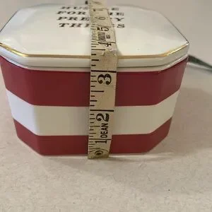 Chic trinket box with red and white stripes. Features gold lettering on the lid. Perfect condition!