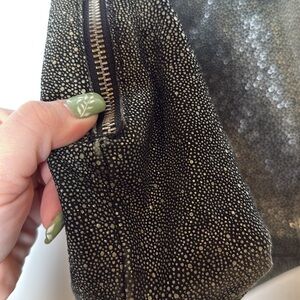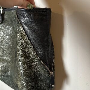The Vin Baker Women's Terra Shoulder Bag is a luxurious and stylish handbag crafted from Italian leather in a unique speckled green finish. Made in the USA, this elegant bag features a magnet closure, side zippers to expand storage capacity, and a versatile shoulder strap for comfortable wear. Perfect for everyday use or special occasions, it combines functionality with high-end craftsmanship.