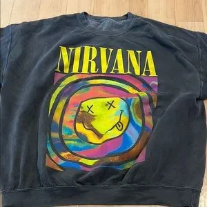 This NIRVANA crewneck sweater showcases a striking yellow smiley face graphic on a grey background. The vibrant design is enhanced by a hypnotic swirl of colors, making it a standout addition to any collection.