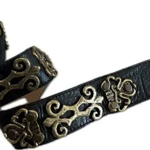 Leatherock-beautiful, black leather belt with brass accents made in the USA. Has some weight to it. Excellent preloved condition. Leather Measures 36”, Buckle 3” x 3”.