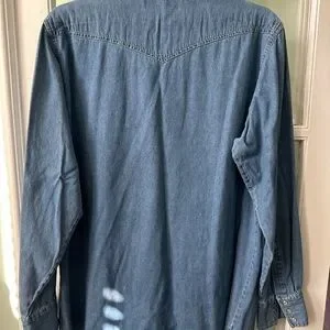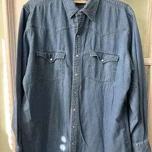 Stylish blue denim shirt with button-down front and chest pockets. Perfect for casual wear.