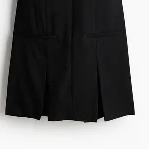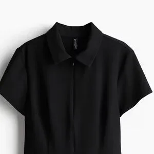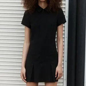 Short, fitted dress in twill. Collar, concealed zipper at front, and short sleeves. Tapered waist, mock welt front pockets, and inverted box pleats at front and back of hem. Unlined.