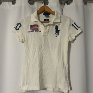 White polo shirt with Team USA Olympic and Vancouver 2010 design. Slim fit, size small. Has yellowing, mostly from being 15 years old. Open to offers and bundles.
