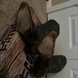 Stylish black cowboy boots with intricate embossed design with black caiman inlay. Perfect for any occasion. In good condition.
