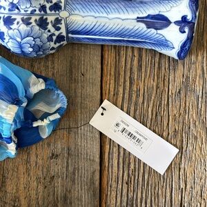 Elegant dress with a flattering blue and white wave pattern. Features a cinched empire waist, 3/4 puffy sleeves and breezy maxi dress cut from billowy fabric.