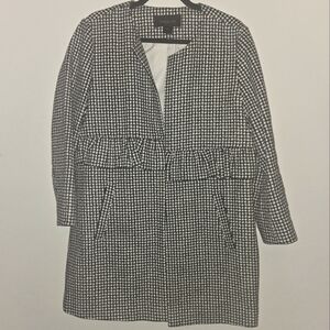 Chic houndstooth coat from Ann Taylor Factory, perfect for adding a touch of sophistication to any outfit. This stylish jacket features a classic black and white houndstooth pattern, a flattering silhouette, and unique ruffle pocket details that add a feminine touch. The coat is fully lined and has a clean, open-front design, making it easy to layer over your favorite tops and dresses. Ideal for wearing to the office, a business meeting, or a stylish brunch with friends.