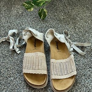Step out in style with these chic beige woven sandals. Perfect for any casual outing. Never worn before. Imperfections pictured!