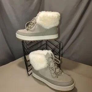 Embrace the winter chill with these enchanting Koolaburra boots, enveloping your feet in luxurious warmth. Their faux fur lining whispers secrets of cozy mountain lodges, while the sturdy design promises steadfast companionship on frosty adventures. Beige and white hues blend seamlessly with winter landscapes, crafting a tale of elegance and resilience.