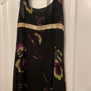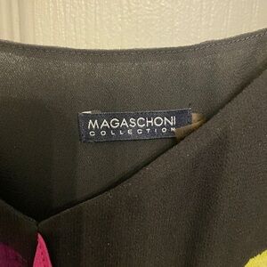 Sleeveless black dress with floral motif, ruffle, and sequin detail at waist. Authentic Magaschoni in flowy and flattering chiffon. Midi length. Zip closure as pictured. In good condition. Size 12 but fits slightly small.