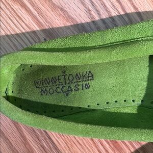 These Minnetonka moccasins feature a vibrant green hue, offering a stylish slip-on design with a decorative fringe along the top. Crafted from a soft, suede-like material, they provide comfort and a unique look for casual wear.