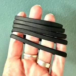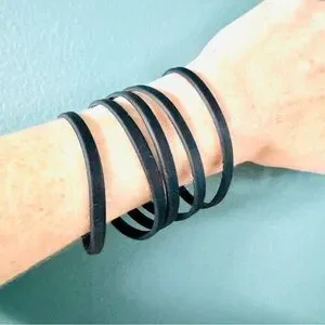 Set of 15 Hot Topic Black Rubber Gummy Bracelets. 15 pc lot of flat thick Jelly Wristbands circa 80s Madonna retro fashion. Flexible bands bangles. A touch of give to fit over your hand, minimal stretch. Has a hint of shine to the black matte finish. For men or women, unisex