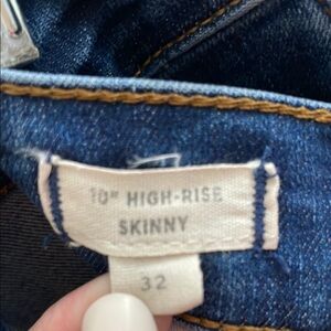 These Madewell jeans offer a sleek and modern silhouette with their cropped ankle design, perfect for highlighting your favorite shoes. The classic blue hue adds a timeless touch, making them a versatile staple for any wardrobe. Crafted with quality and style in mind, they provide both comfort and a chic look for any occasion. Pretty copper color button fly. Have great stretch and raw edge ankle hem. Approx waist 17 inches, rise 11 inches, inseam 28 inches. Size 32