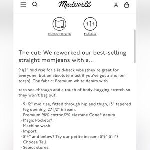 Madewell The Mid-Rise Perfect Vintage Straight Jean in Tile White NWT