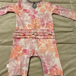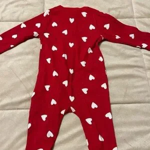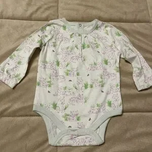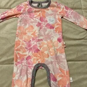Two long sleeve pjs, one with ruffles on the bum. And a onesie with little tigers all over it. All new , never worn but without tags, baby gifts.