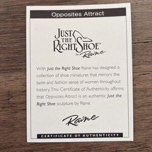 Just the Right Shoe by Raine. “Opposites Attract”. Item no - 25390. Brand new in box. Classy and Sassy piece to add to any collection.