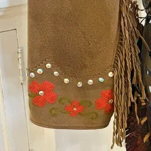Vintage Western jacket in brown suede leather with distinctive design elements. This piece is missing a button and a stone.