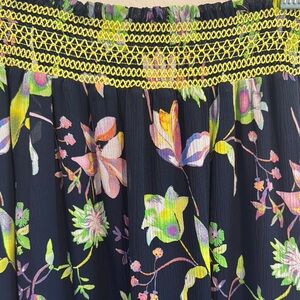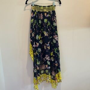 Tanya Taylor floral midi skirt in size 2 featuring a vibrant navy and yellow botanical print. Lightweight and breezy with layered ruffles and an asymmetrical hem. Elastic waistband with gorgeous embroidered detail. In excellent condition.
