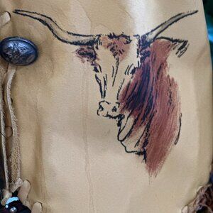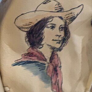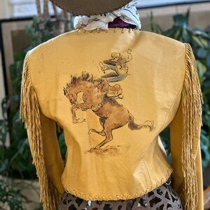 This is a stunning vintage Double D Ranch wear jacket from Yoakum, Texas, in a size S. It's a beautifully crafted Western-style leather jacket in a soft buckskin/cream color with intricate hand-painted or hand-drawn artwork depicting various Western scenes.