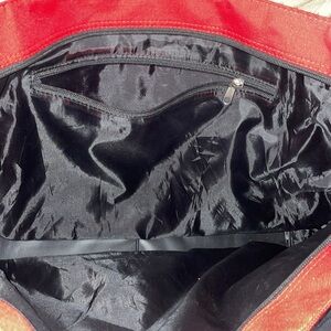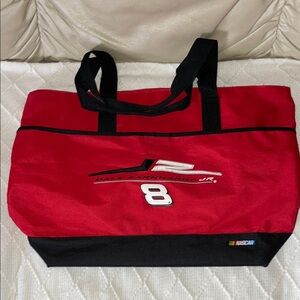 Dale Earnhardt Junior #8 NASCAR Canvass Tote Bag. This stylish red & black bag is perfect for any NASCAR fan. 1 zipper pocket inside. 1 outside pocket with Velcro. Full Zip enclosure on top. 22” width & 18” height. In excellent condition. Smoke & pet free home.