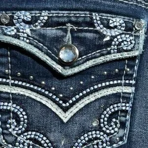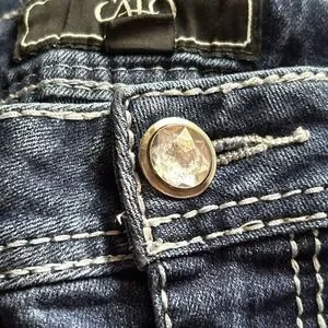 The product is a pair of Cato Capri Blue Jean in size 12, featuring a cuffed and cropped style with embellishments like rhinestones and embroidery. Made of a blend of polyester, spandex, and cotton denim, these jeans have a high rise and a 21-inch inseam, 32-inch waist, making them a stylish choice for any season. With a zip closure, 5-pocket design, and stretchy fabric, these jeans offer both comfort and fashion for the modern woman. Ideal for casual wear, these jeans are machine washable and perfect for everyday wear.