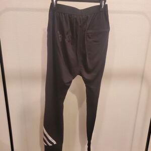 Stylish and comfortable unisex track pants featuring a sleek black design with white stripes. Perfect for casual wear or workouts.