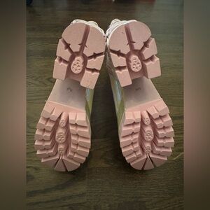cuz you're floating into an elevated reality. These calf-high platform boots have an iridescent construction, adjustable lace-up details on the front and back, side zip closures, and chunky rubber cleated outsoles.