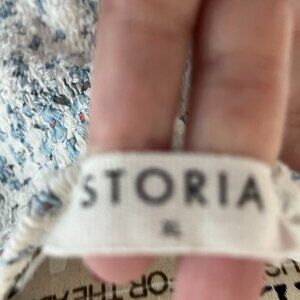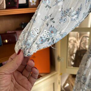 Beautiful white with blue flowers maxi dress. Suitable for prom, summer event, or garden party. Sweetheart neckline, fully lined except for sheer sleeves. 2 slits in front and elastic in back. Size XL.