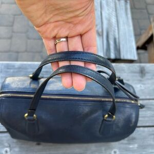 EUC. No callouts. Coach Poppy East/West Textured Patent Leather Satchel. Distinctive crosshatch texture, with leather bow accent & 2 hangtags. Multi-function interior pockets, zip-top closure. Pink satin lining. Handel drop 5 3/4"