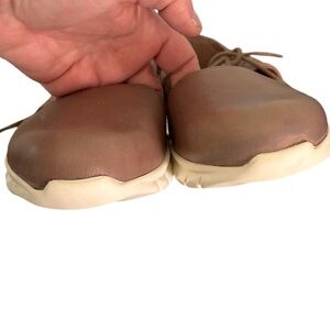 These are leather shoes by now that they have tied upper and man- sole. As a floor sample they have been tried on but not worn. No defects noted. A great quality shoe in the perfect neutral color.