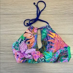 Trina Turk bikini top with matching bottom. Vibrant floral halter bikini top with a keyhole front + matching bottom. Features a mix of pink, orange, green, and blue colors. Size 12. EXCELLENT CONDITION, only worn 1x