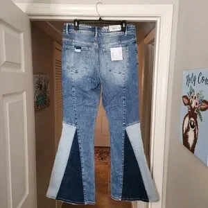 new with tags flare jeans with multi denim patchwork on flare. very very cute! size 31!
