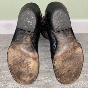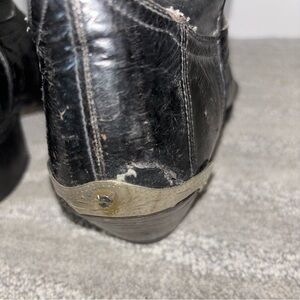 • Small tear in eel skin on heel of right boot