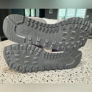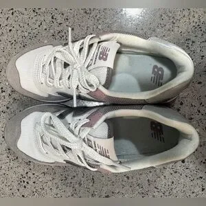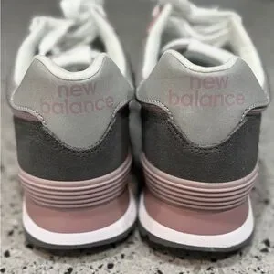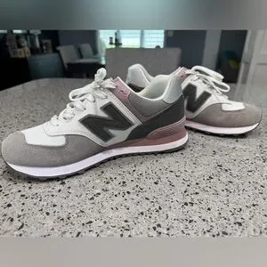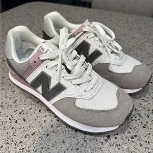 Stylish New Balance Women's 574 Core Casual Sneakers in white and gray with pink accents. Excellent condition - never worn outdoors!