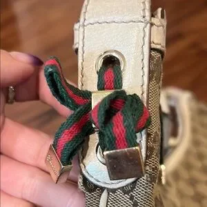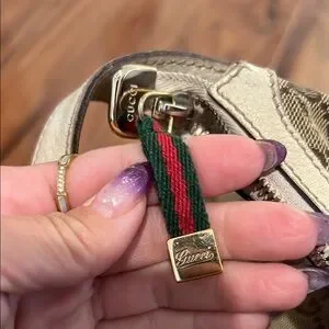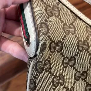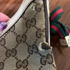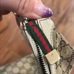 Bag is in well used condition. Measures 14.5 by 12.5 by 1. Some rubbing in the canvas and along the leather edges and strap handle. No holes. Features the beautiful classic Gucci green and red design in the zipper pull. Clean interior.
