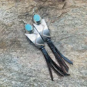 Elevate your style with these one-of-a-kind, custom assemblage earrings—where art meets craftsmanship. Featuring an asymmetrical design, these sterling silver and 14K gold-filled panel earrings showcase stunning sterling silver and oval turquoise cabochons and rich brown leather tassels. Their handcrafted charm, inspired by Native American artistry, makes them a standout accessory for those who love bohemian beauty with a twist.