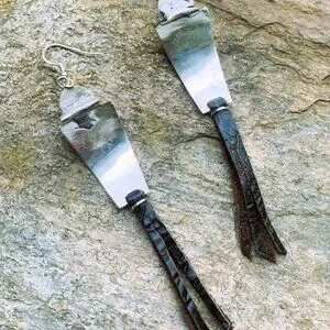 I had the watch panels in my inventory, but I couldn't really find a suitable watch for them. They were made by a local North Carolina artist (Judy Ochs), who specializes in modernist jewelry design. So, I decided they needed to be earrings. The cabochon earrings were soldered personally by me, to the tips, along with the addition of brown embossed leather for a dramatic touch. They measure 4 3/8" long, and at the widest point 3/4". The hooks are sterling silver as well.