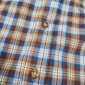 Made with fine worsted wool, this shirt offers durability and warmth. Its classic plaid design in brown and blue adds timeless style.