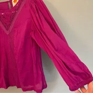 Vibrant and full of life — this FARM Rio x Anthropologie “Kelsie” blouse captures the brand’s signature bohemian charm. Featuring a deep magenta base with colorful embroidery and print details, this top brings joy and movement to any outfit. The v-neckline and puff sleeves add a flattering, feminine touch. Perfect for pairing with denim, linen pants, or skirts for a polished, carefree look.