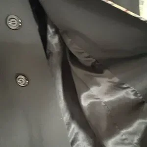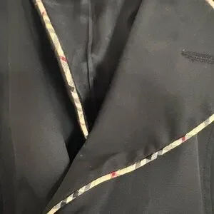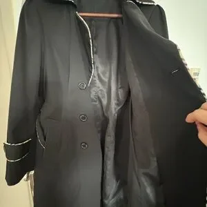 Stay stylish and warm with this elegant black double-breasted coat. Perfect for any occasion. This is a burberry sample. It was created to test it out and then it was on the market. It has been worn 4 times, is in perfect condition, is luxurious and the most amazing fabric. make me an offer as I do not need it! the piping is gorgeous !