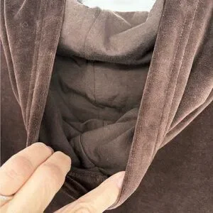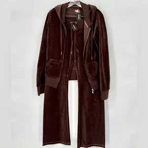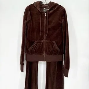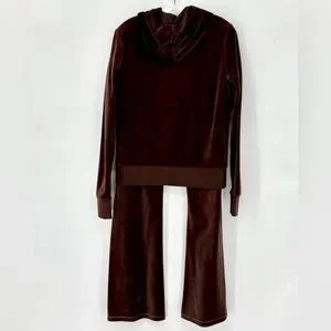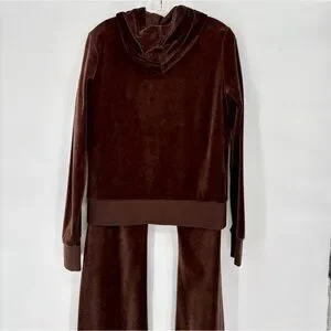 Luxurious brown velour tracksuit. Includes a zip-up hoodie and matching pants. Perfect for casual wear.